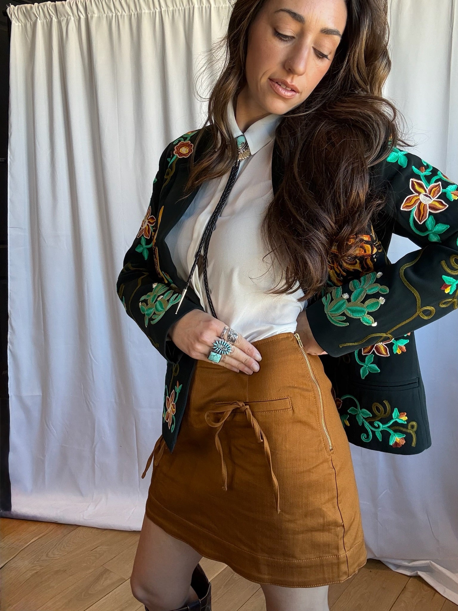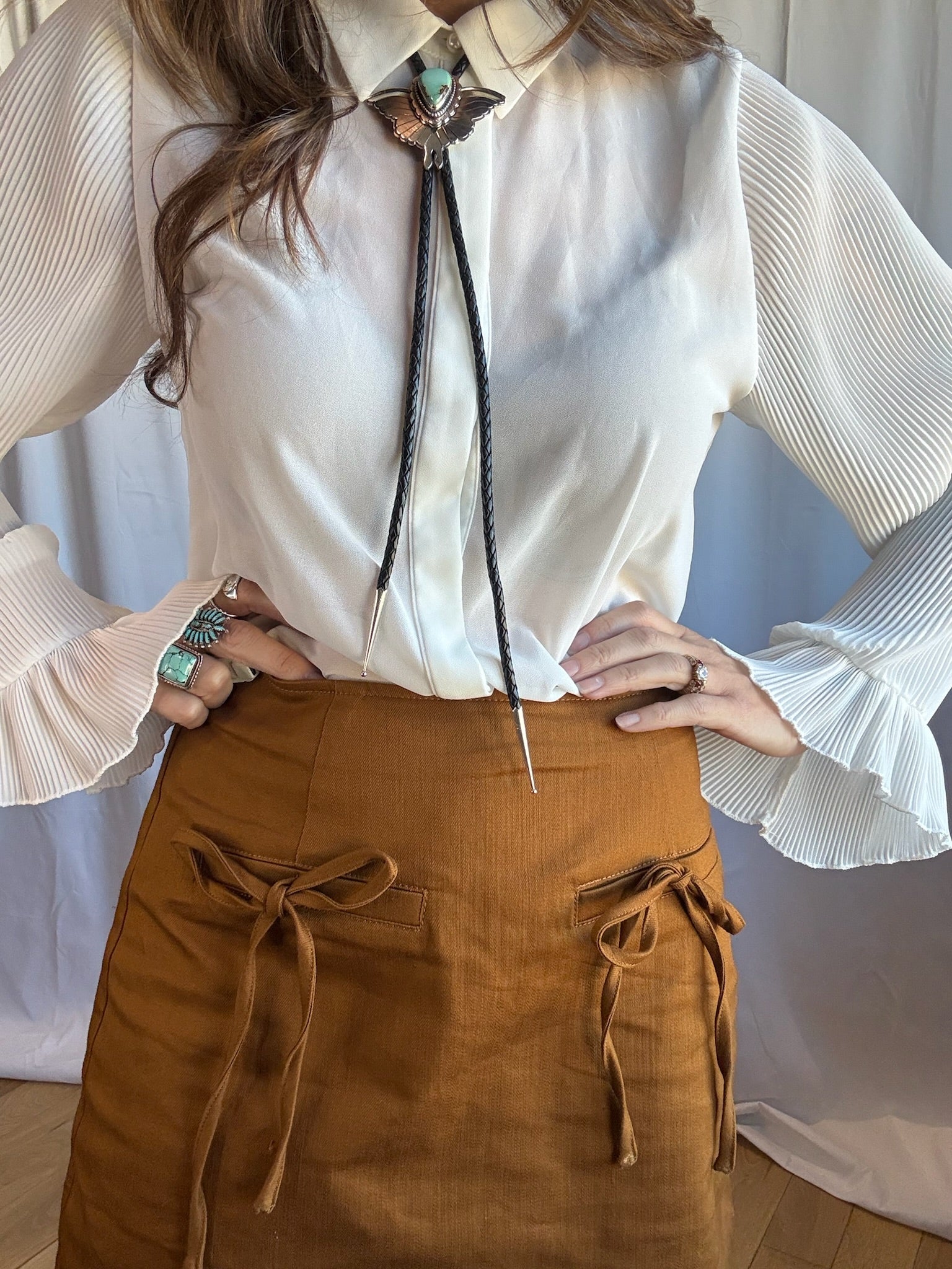 This cutie little mini skirt has a very clean profile with two faux pockets and bows that cascade down the front. The material is soft with a subtle sheen and flex from the cotton spandex blend. There is a brass exposed side zipper and large firm hem. The color is so rich and is an easy shade to match with neutrals and color. The waistband runs a little small so if you are in between sizes we recommend sizing up.