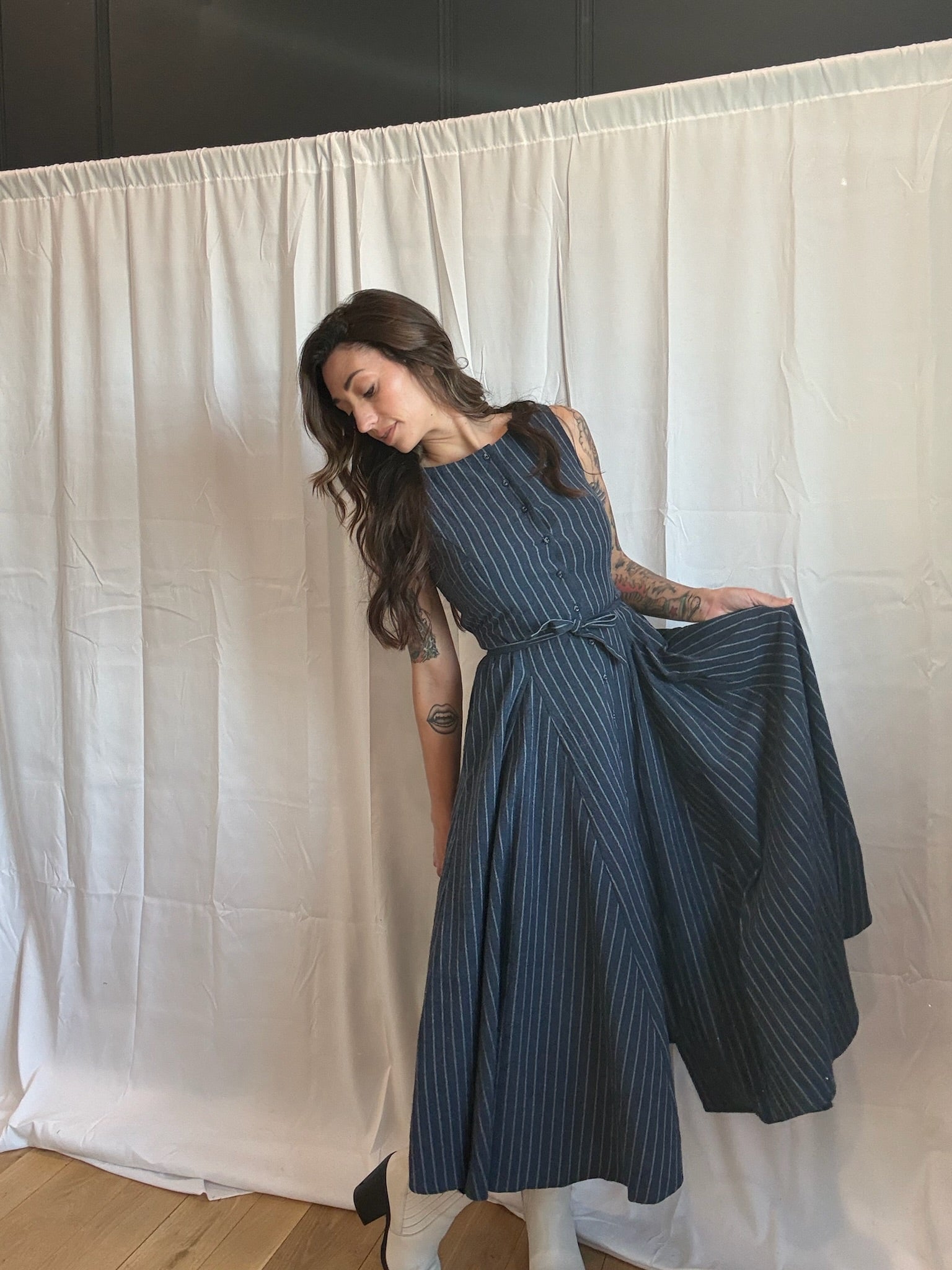This tea length button front linen dress has a subtle little stripe against the dark blue background. It has ties sewn into the side seams of the dress so you can wrap it around or tie it on the front or back to accentuate your waist. below the ties the dress flows outward in a generous A line giving the wearer a very feminine silhouette. This dress has functional hidden pockets at the sides, and a full back. A classic look that never goes out of style.