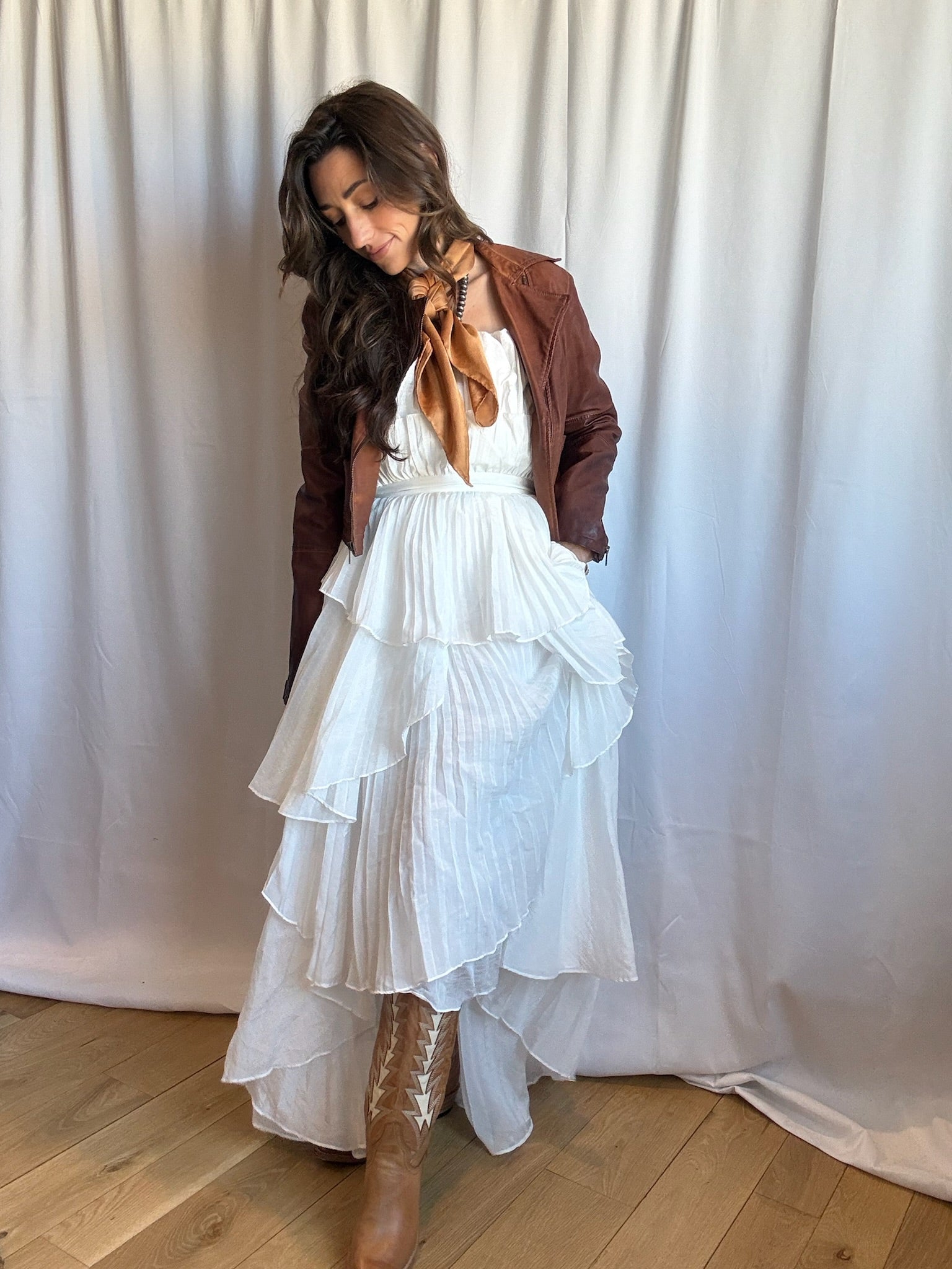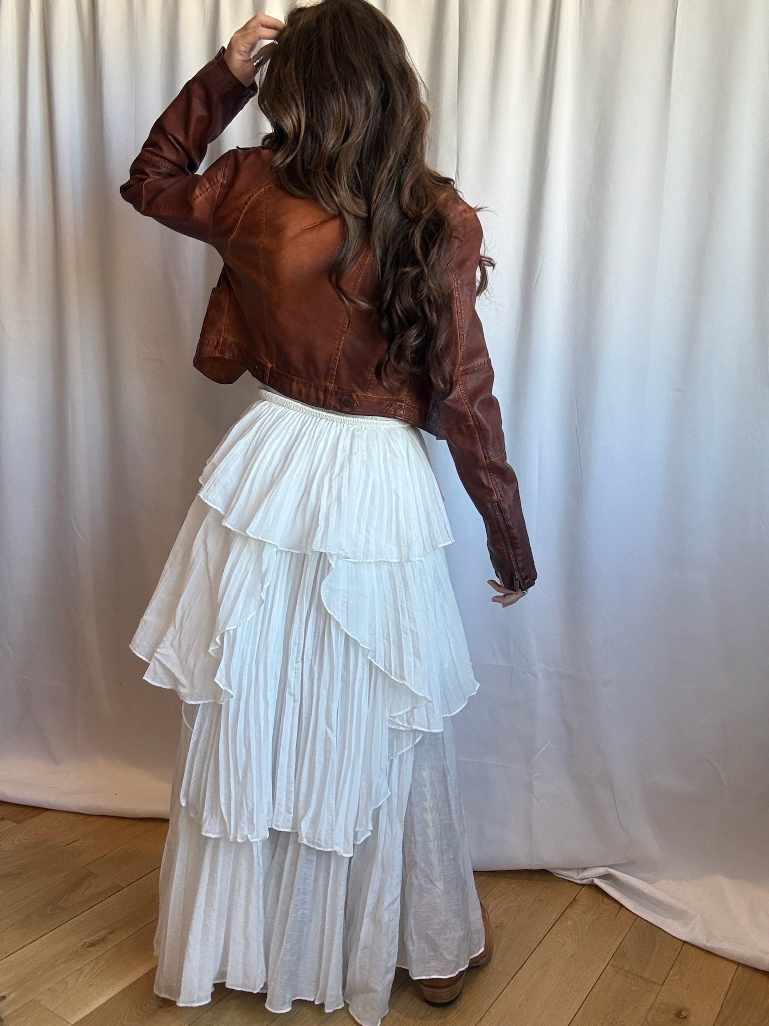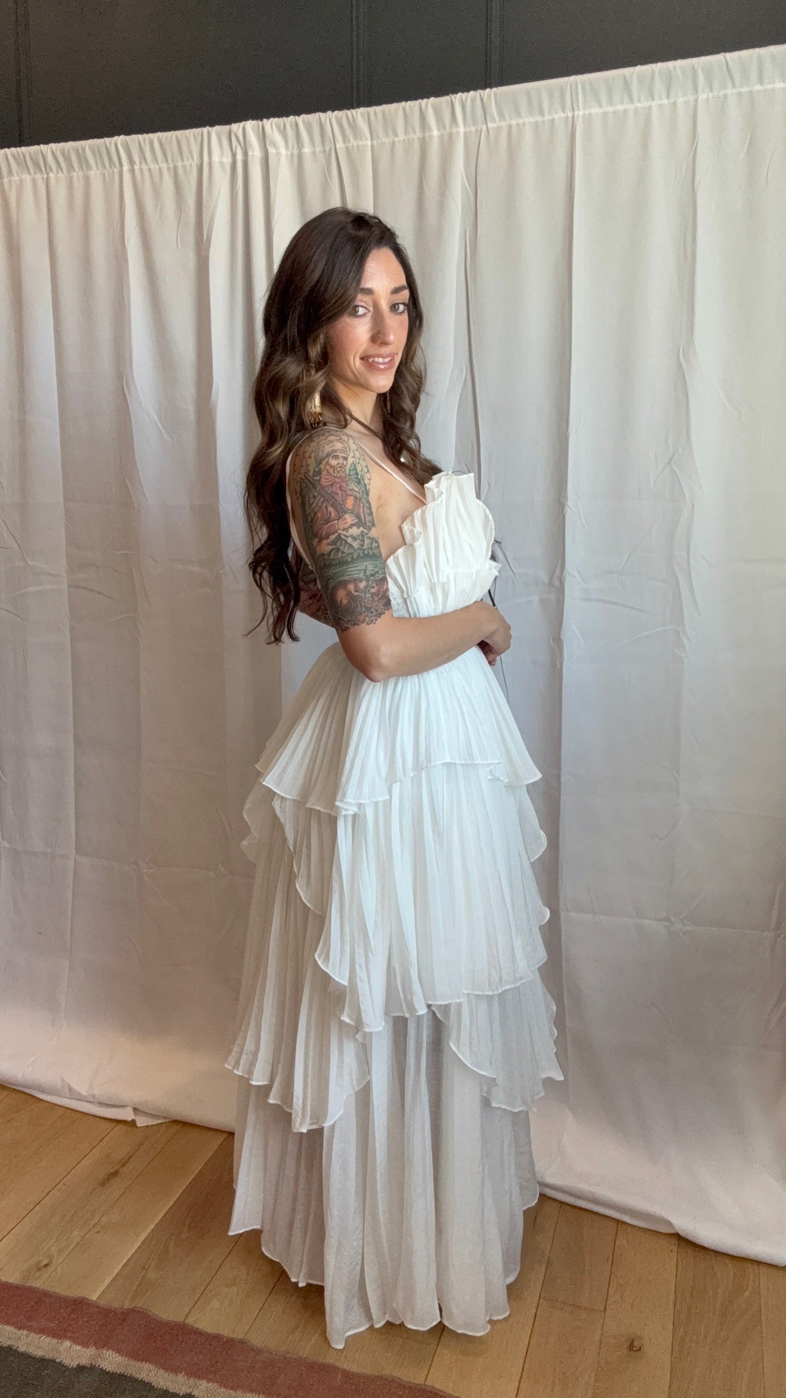 This stunning dress has layers upon layers of white pleated fabric cut in a tulip petal shape, asymmetrical hem, and a cinched waist giving its wearer a beautiful hourglass figure. The layers are light, flowy and full of easy movement. The straps of this dress are adjustable and removable so it can be worn as a strapless, cross back or straight straps. While the front chest area of the dress is structured the upper back is shirred making sizing easy and forgiving. Whether you have a party, picnic, or brunch, this dress can do it all going from informal to formal you can style this many ways so you can get the most wears from this petal dress!