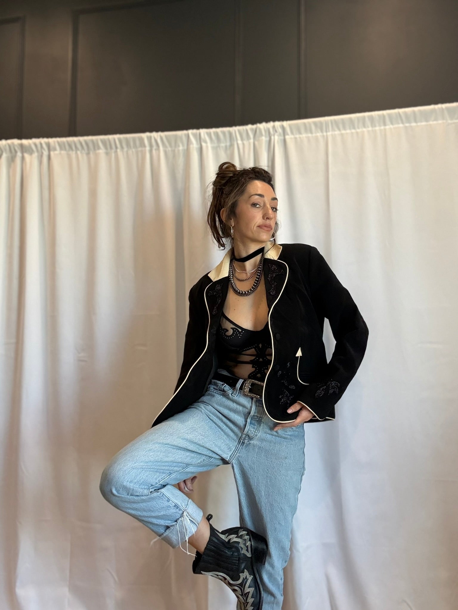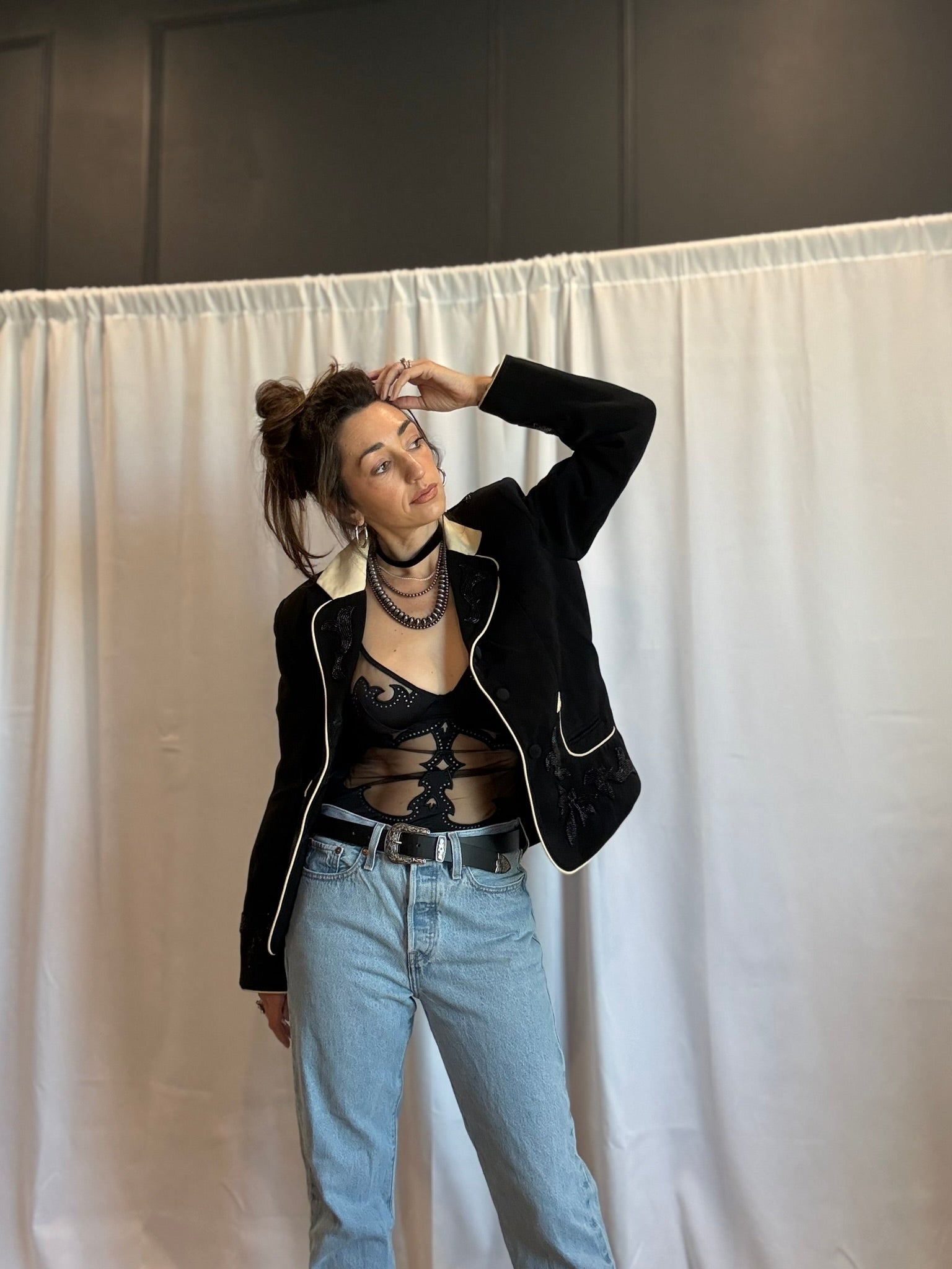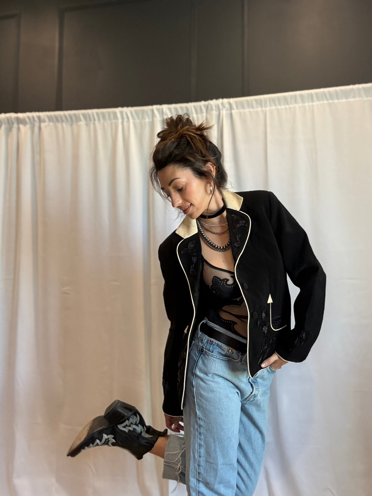 This Jacket is a stunner! Easily add sparkle to any outfit by throwing on this blazer. She can go to work, to an event, to dinner, to a day out and about. This is a wardrobe staple that will never go out of style and can live in your closet forever. It is fully lined, adorned with beading and real leather. The front pockets are functional and have sweet little leather piped smile pocket details. This Jacket is cut in more of a boxy fit, and therefore is a bit roomier than a tailored blazer. If you want a more fitted look we suggest sizing down.