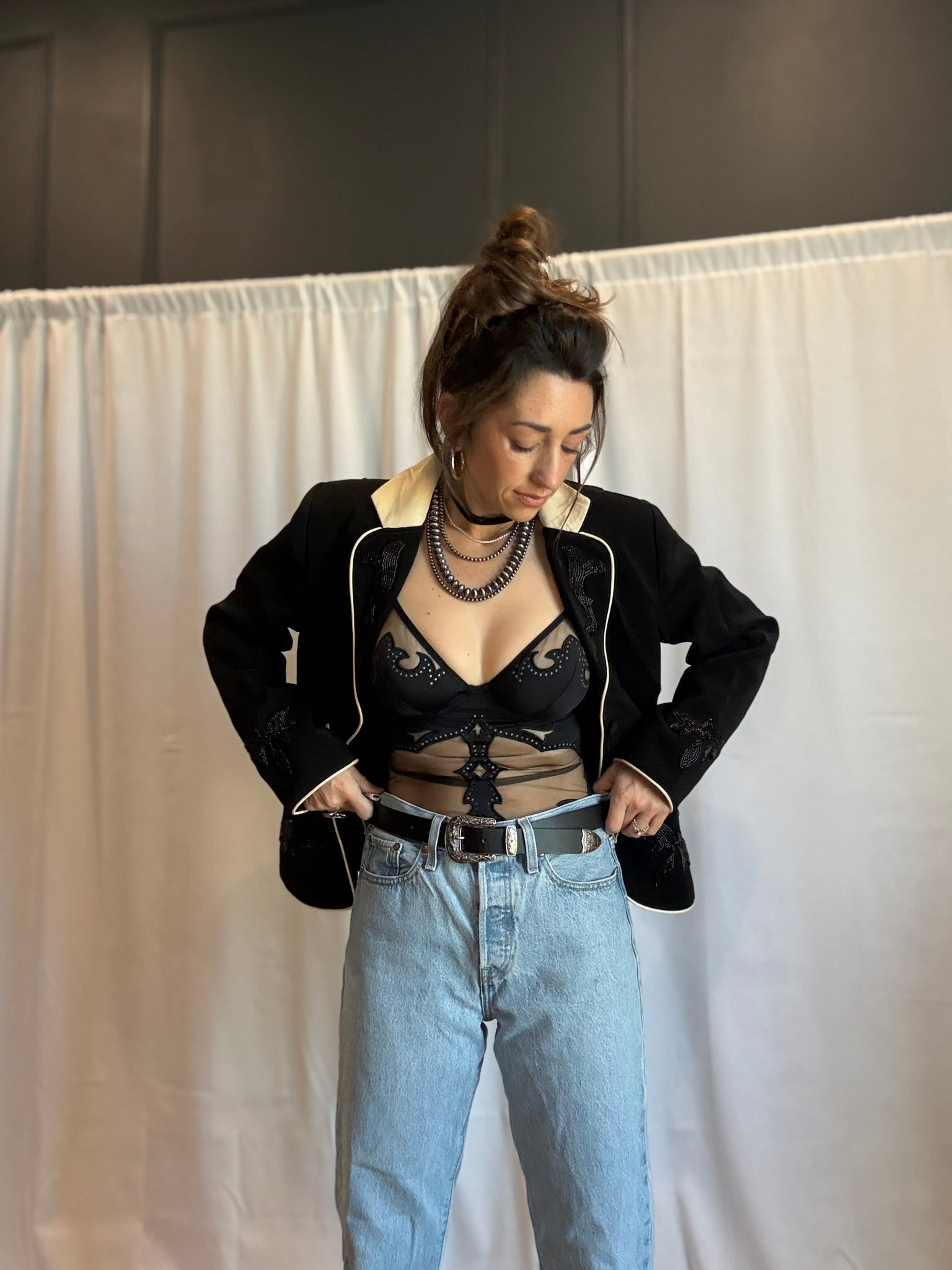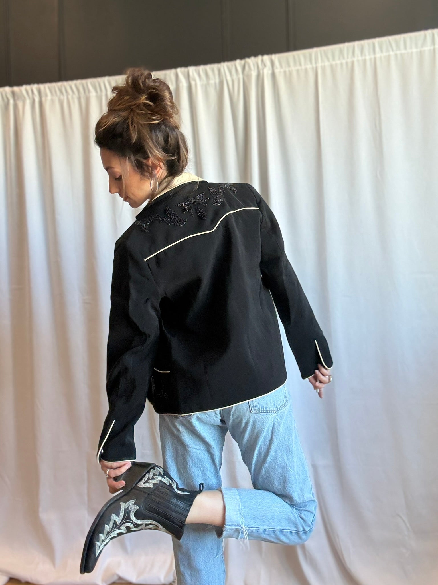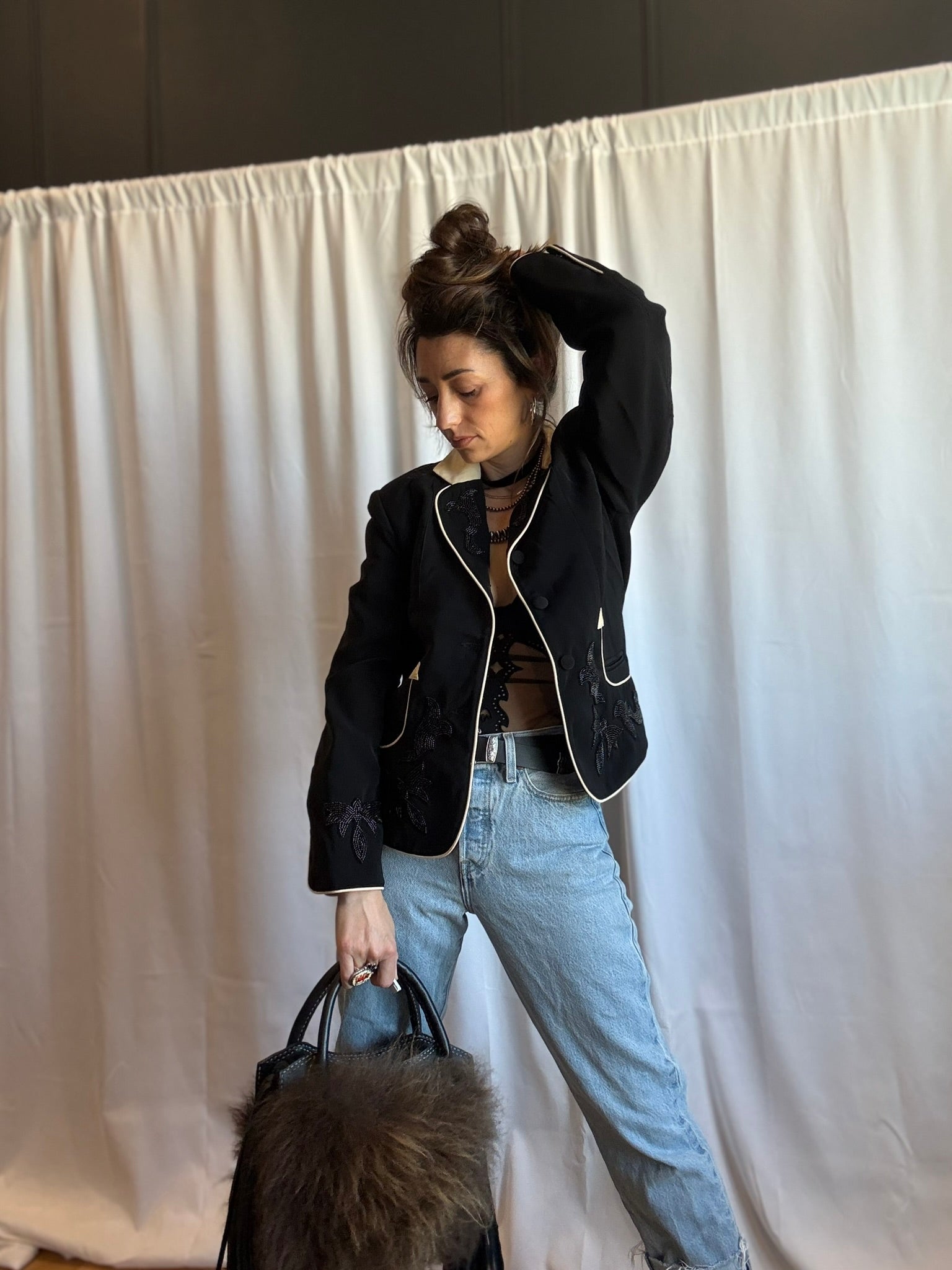This Jacket is a stunner! Easily add sparkle to any outfit by throwing on this blazer. She can go to work, to an event, to dinner, to a day out and about. This is a wardrobe staple that will never go out of style and can live in your closet forever. It is fully lined, adorned with beading and real leather. The front pockets are functional and have sweet little leather piped smile pocket details. This Jacket is cut in more of a boxy fit, and therefore is a bit roomier than a tailored blazer. If you want a more fitted look we suggest sizing down.