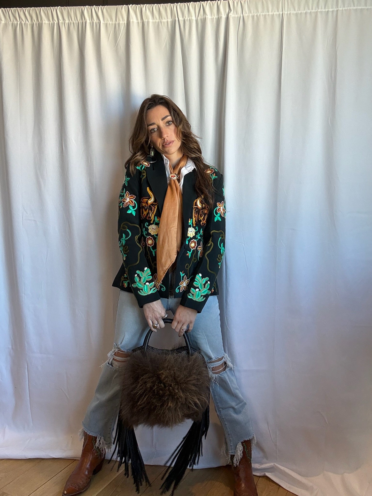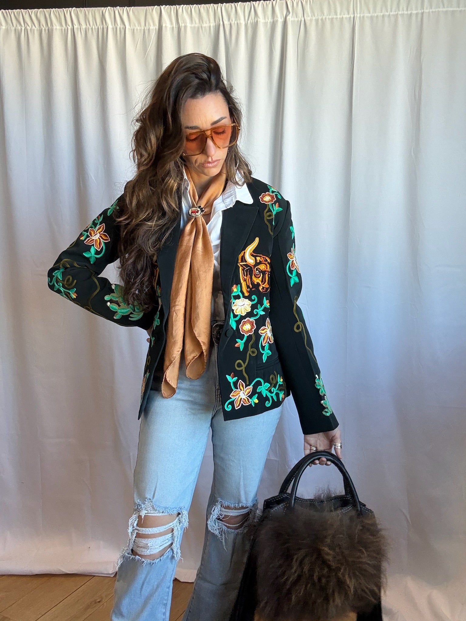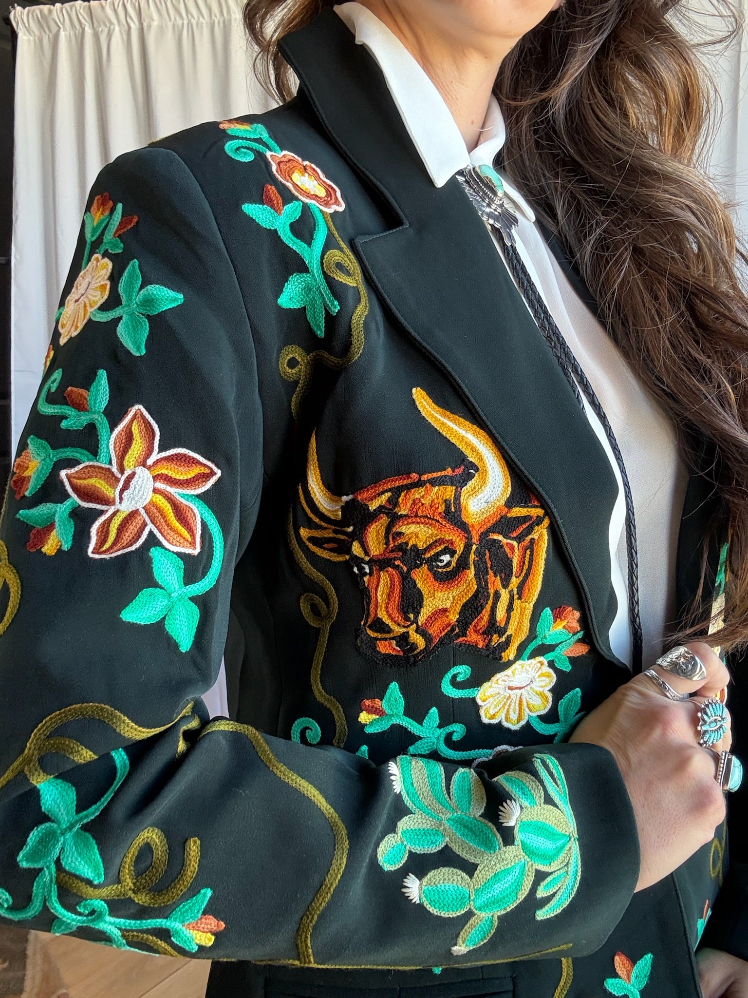 Where do we begin with this blazer. This jacket is everything that Roam embodies, quality, uniqueness, and beauty. Set on a soft black background the vines, flowers, and bulls are embroidered with contrasting colors in vintage fashion with chain stitch technique, and a fully lined interior. This stunning blazer gives you the real deal vintage look with a modern tailored fit. Whether your going to the board room, running day time errands like a boss, or ready for a night on the town, you will steal the attention from any room. This is the blazer that dreams are made of, and it will be an item that will stand the test of time in your wardrobe, because a jacket this good never goes out of style.