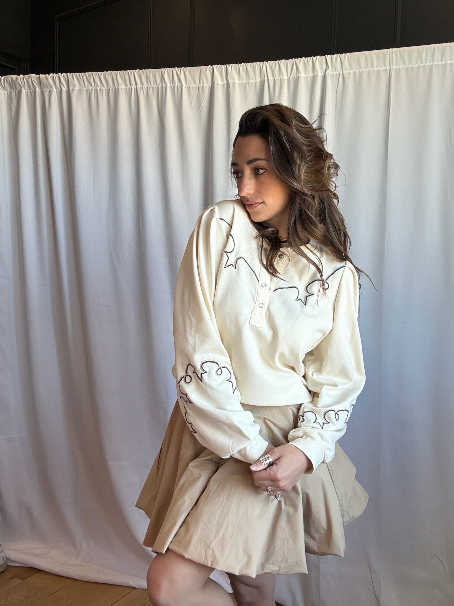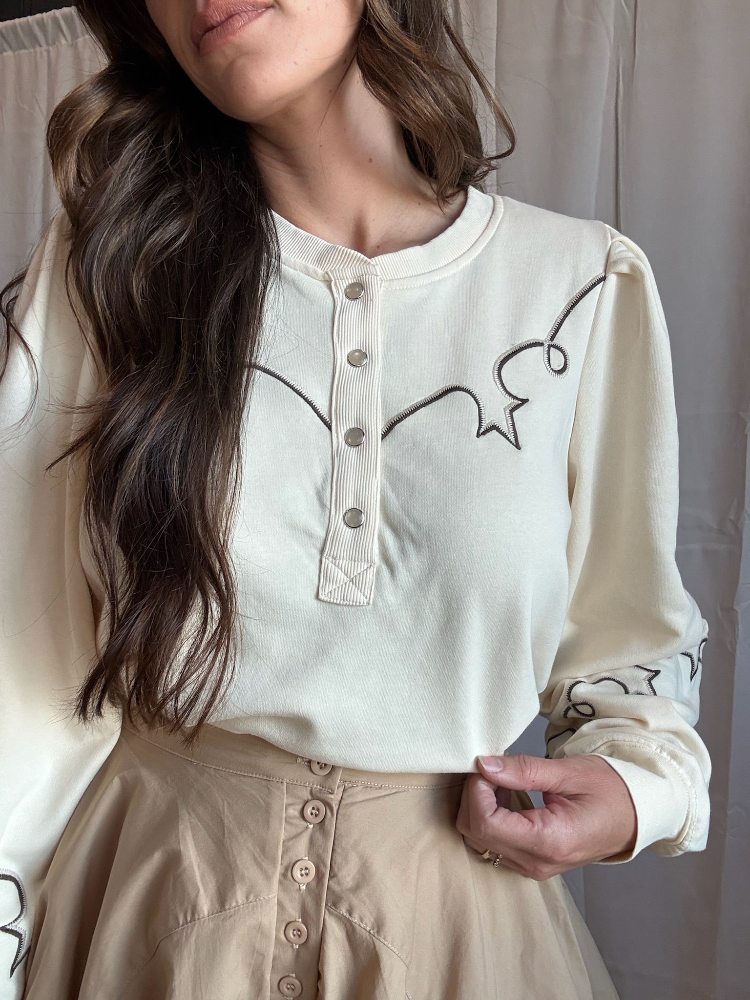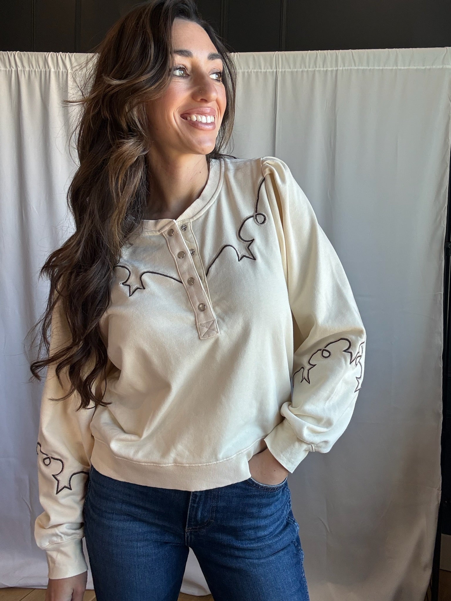 Hey Howdy Hey, this lightweight crew neck sweatshirt is the perfect way to elevate your everyday basics. Cute little boot stitch embroidery loops around the neckline and balloon sleeves. There are also little pearl snaps at the neckline that make it easy to layer with a collared shirt underneath, or to show off some jewelry.